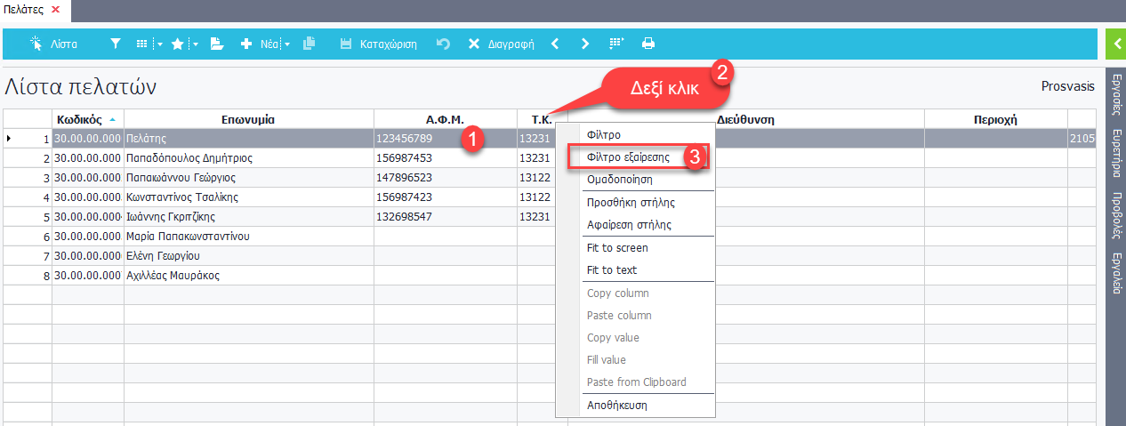 Παράδειγμα: Εάν θέλετε να φιλτράρετε μια λίστα συναλλασσομένων εξαιρώντας αυτούς που ανήκουν σε συγκεκριμένο Ταχυδρομικό Κώδικα, επιλέξτε με την μπάρα επιλογής ή με κλικ έναν πελάτη με το συγκεκριμένο Τ.Κ. και στην επικεφαλίδα της στήλης εκτελέστε το «Φίλτρο εξαίρεσης».