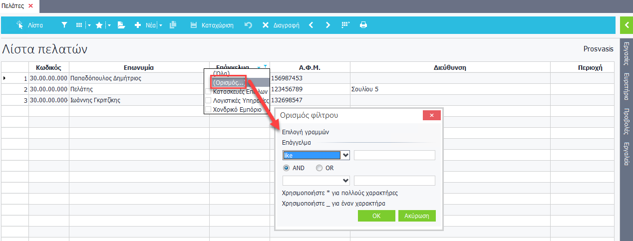 • να επιλέξετε τα πλαίσια δίπλα στα δεδομένα που θέλετε να δείτε π.χ. τους πελάτες με επάγγελμα «Κατασκευές Επίπλων, Λιανικό εμπόριο τροφών, Λογιστικές Υπηρεσίες». Με κάθε επιλογή πραγματοποιείται αυτόματο φιλτράρισμα.