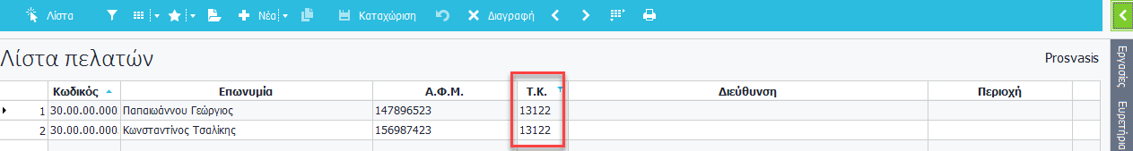 Παράδειγμα: Εάν θέλετε να φιλτράρετε μια λίστα συναλλασσομένων με κοινό Ταχυδρομικό Κώδικα, επιλέξτε με κλικ έναν πελάτη με τέτοιο Τ.Κ. και στην επικεφαλίδα της στήλης Τ.Κ. εκτελέστε το «Φίλτρο».