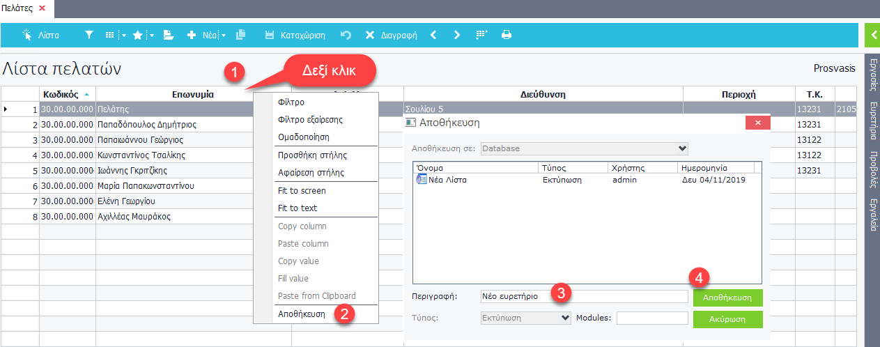 - Εξαγωγή σε Clipboard: Εκτελείται Εξαγωγή των επιλεγμένων εγγραφών για χρήση τους σε άλλη βάση. Η εισαγωγή πραγματοποιείται απο Μενού εργαλείων > System > Συνδέσεις & δεδομένα > Εισαγωγή από Clipboard.