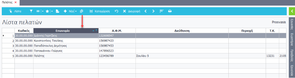 Μέσω αυτού του χειρισμού ταξινομείτε τις εγγραφές της προβαλλόμενης λίστας βάσει της στήλης στην οποία εφαρμόστηκε π.χ. στην «Επωνυμία».