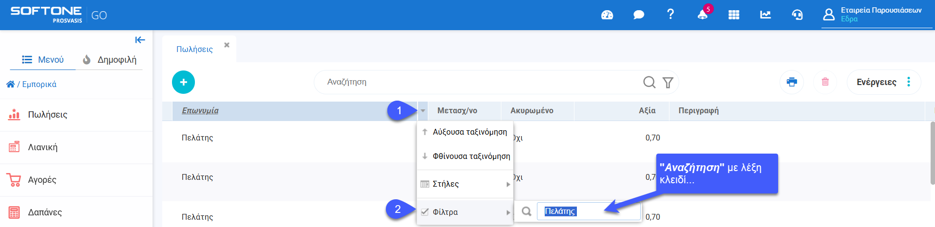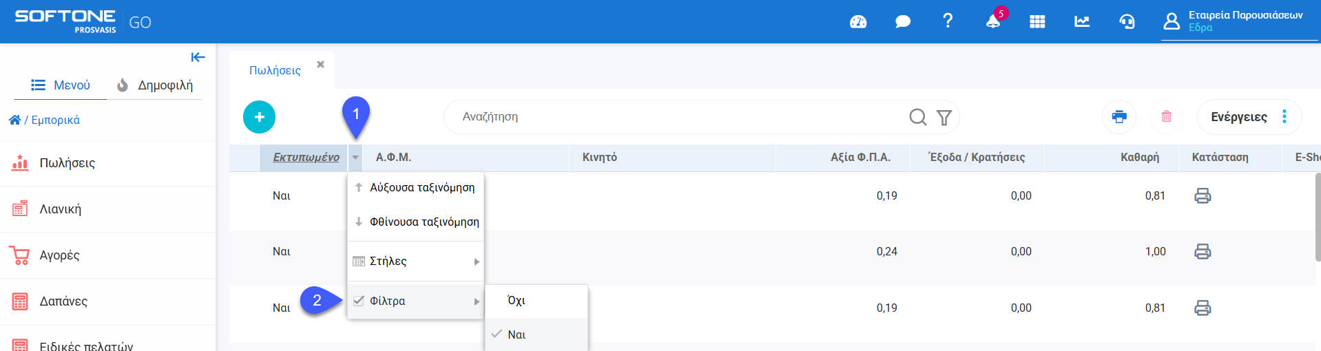 Σε προβολή Ευρετηρίου Πωλήσεων και Αγορών  , από τη στιγμή που θα εμφανιστούν εγγραφές (βάσει μιας ανεύρεσης που προηγήθηκε), μπορείτε να φιλτράρετε τα δεδομένα για να εμφανίσετε μόνο τις πληροφορίες που χρειάζεστε. Μπορείτε ακόμη να χρησιμοποιήσετε περισσότερα από ένα φίλτρα για να περιορίσετε περαιτέρω τα αποτελέσματά σας.