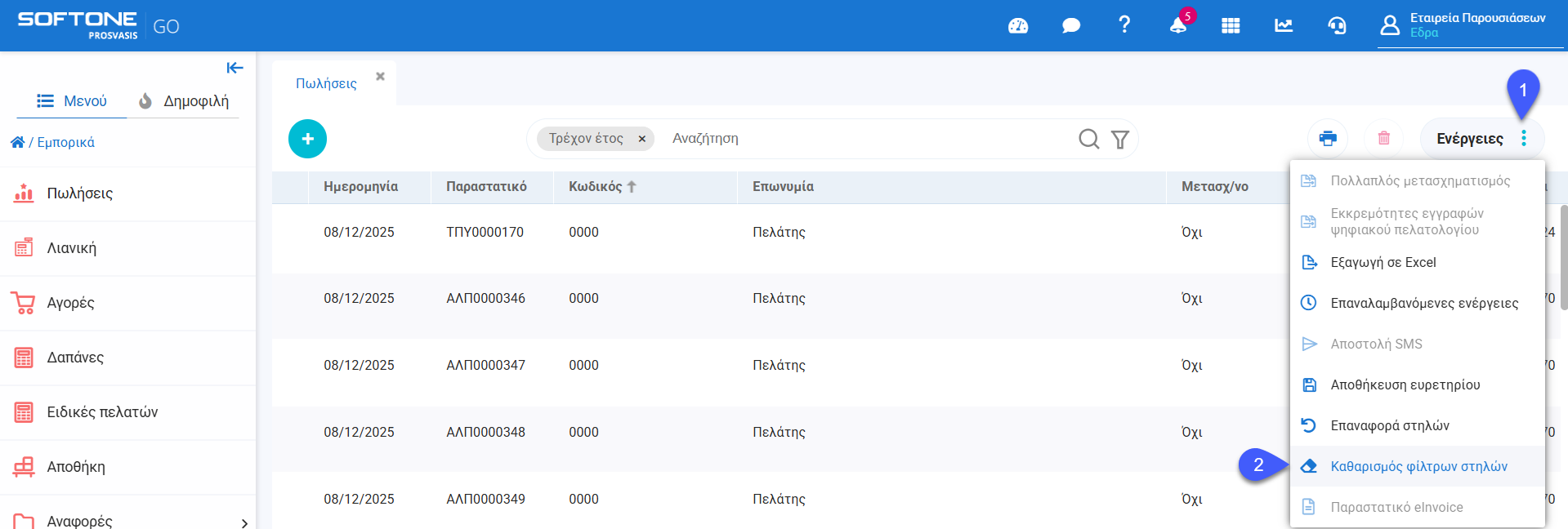 Σε περίπτωση που ο χρήστης επιθυμεί να πραγματοποιήσει καθαρισμό των επιλογών του, παρέχεται ενέργεια ως «Καθαρισμός Φίλτρων στηλών»