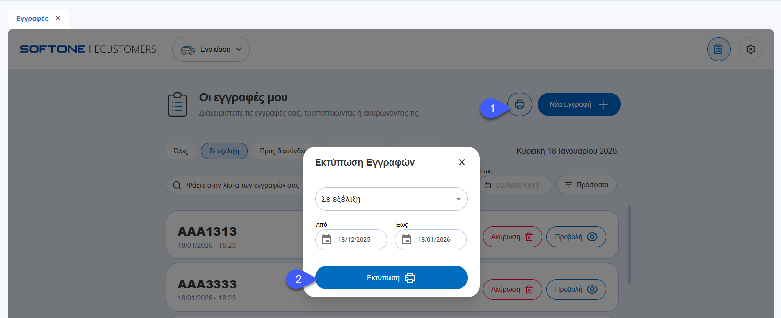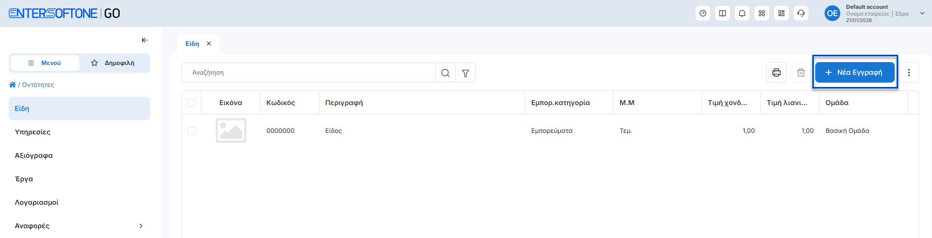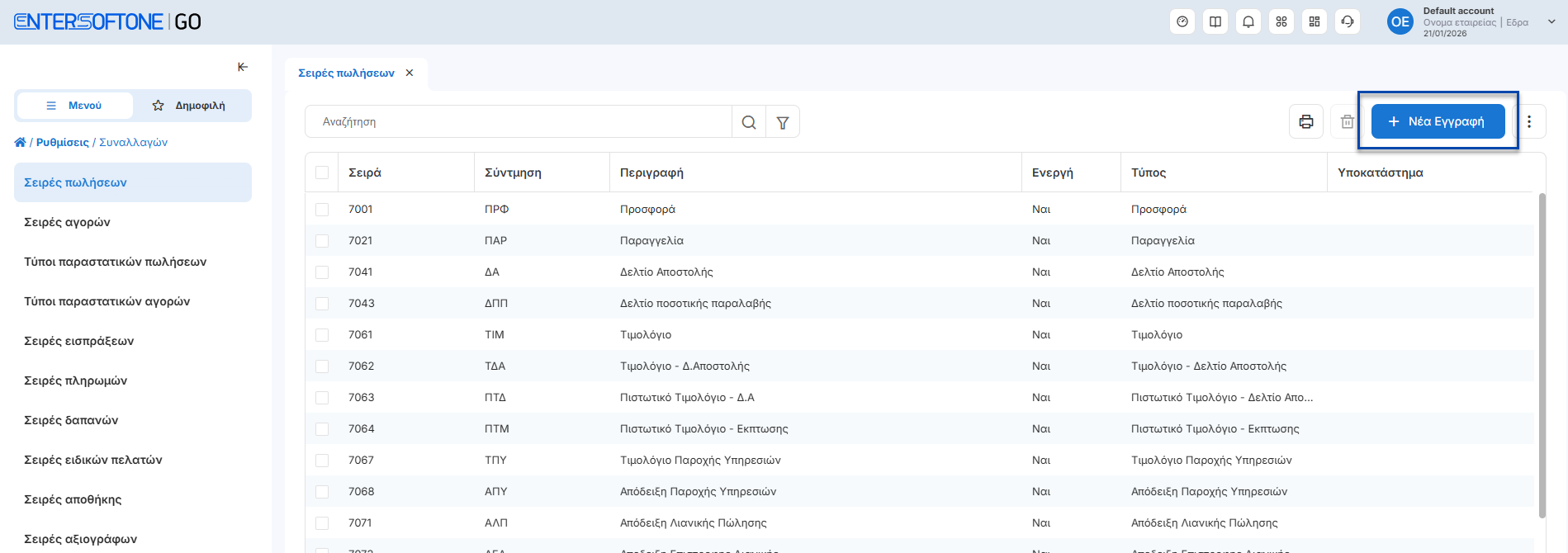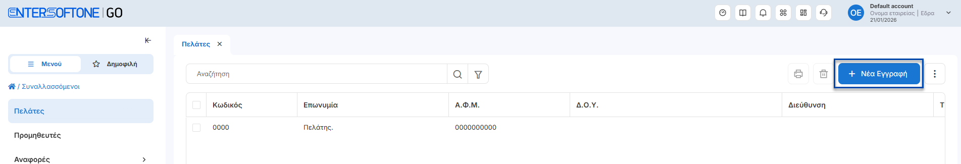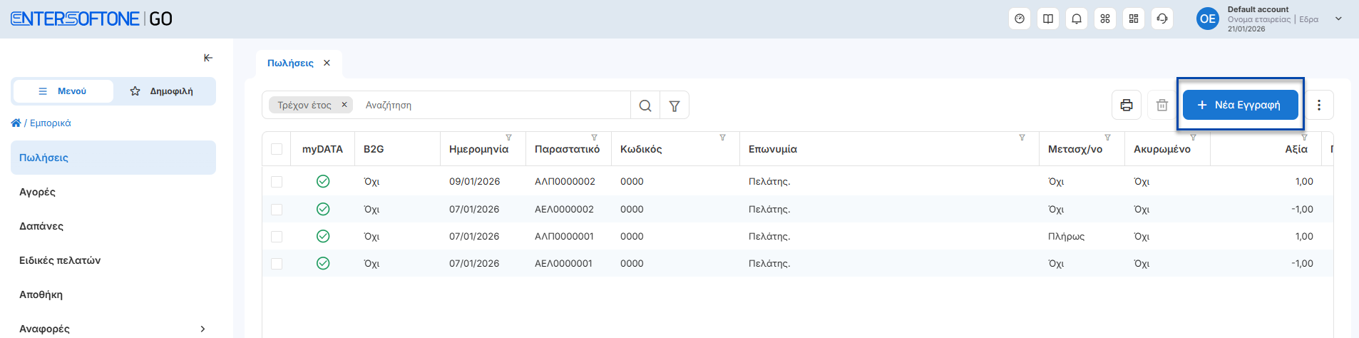 Αναβάθμιση της εμπειρίας του χρήστη - καταχώρηση εγγραφών (Εμπορικά, Οντότητες, Συναλλασσόμενοι, Ρυθμίσεις)Η επιλογή για νέα καταχώρηση εγγραφών μεταφέρθηκε στη δεξιά πλευρά της φόρμας καταχώρησης για πιο εύκολη πρόσβαση.Κύκλωμά εμποριικών:Κύκλωμα οντοτήτων:Κύκλωμα συναλλασσόμενων:Ρυθμίσεις συναλλαγών:Η λειτουργία προσθήκης γραμμών στο παραστατικό έχει μεταφερθεί επάνω από τις γραμμές, για πιο άμεση και ευδιάκριτη χρήση.ΠροσθήκεςΚύκλωμα Πωλήσεων : Υποστήριξη πωλήσεων Tax FreeΣτη νέα έκδοση του EntersoftOne Go παρέχεται η δυνατότητα έκδοσης παραστατικών Tax Free, για συναλλαγές με πελάτες από χώρες εκτός Ευρωπαϊκής Ένωσης.Η λειτουργικότητα επιτρέπει την καταχώρηση και διαχείριση παραστατικών μέσα από Νέους Τύπους παραστατικών Πωλήσεων7150 – Απόδειξη Λιανικής Πώλησης Tax Free7250 – Απόδειξη Επιστροφής Λιανικής Tax Free📌 Για περισσότερες πληροφορίες σχετικά με τον τρόπο καταχώρησης των παραστατικών Tax Free, μπορείτε να ανατρέξετε στον σχετικό οδηγό χρήσης. Σχετικό εκπαιδευτικό video ENTERSOFTONE GO: Καταχώρηση παραστατικού TaxFree Παραστατικά Αναστολής ΦΠΑΔυνατότητα επιλογής νέας στήλης στις γραμμές Ειδών για τα Παραστατικά με την ενδειξη (Αναστολή ΦΠΑ) στον Τύπο Πωλήσεων τους. Μπορείτε να εγκαταστήσετε την φόρμα εκτύπωσης "Αναστολή Φ.Π.Α.", πατώντας εδώ.📌Η στήλη μπορεί να αποθηκευτεί ώστε να εμφανίζεται μόνιμα στις επόμενες καταχωρήσεις.Παραστατικά ΔιακίνησηςΕνσωμάτωση Τύπου Πωλήσεων 9947 Ακυρωτικό Δελτίο Αντίστροφης ΔιακίνησηςΣυναλλασσόμενοι – ΠελάτεςΠροσθήκη πεδίου κινητού στα φίλτρα αναζήτησης στην προβολή των πελατώνΚύκλωμα Αγορών : Προσθήκη πεδίου Κύριας Μονάδας Μέτρησης στο κύκλωμα των ΑγορώνΝέος Τύπος από το κύκλωμα των Αγορών, 2093 Τιμολόγιο Αγοράς (Αυτοτιμολόγιση Υπηρεσιών) για καταχωρήσεις σχετικών συναλλαγώνΒελτιώσεις / ΔιορθώσειςΚλάδος Καταλυμάτων : Ενεργοποίηση κυκλώματος με χρήση POS μέσα από την Ενέργεια του Μετασχηματισμού ΕΦΔ υπέρ 3ωνΕναρμόνιση πρότυπης τιμής τρόπου πληρωμής πελάτη μέσα από την γρήγορη καταχώρηση νέας πώλησηςΠροσθήκη μηχανισμών ελέγχου για την έκδοση πιστωτικού μέσω μετασχηματισμού με ημερομηνία προγενέστερη του αρχικού παραστατικούΑναβάθμιση της προβολής των αρχείων εξαγωγής, με εμφάνιση των συνόλων στις στήλες αξιών. Η αλλαγή διευκολύνει την επισκόπηση και τον έλεγχο των δεδομένων.Θερμικός εκτυπωτής:Ενσωμάτωση πεδίου προβολής ώρας καταχώρησης παραστατικού. Προβολή στοιχείων υποκαταστήματος συναλλασσόμενου, εφόσον η τιμολόγηση έχει πραγματοποιηθεί στο υποκατάστημα του συναλλασσόμενου.Προσθήκη κινητού τηλεφώνου, εφόσον το πεδίο είναι συμπληρωμένο στην καρτέλα του συναλλασσόμενου.Νέα για τους χρήστες της εφαρμογής ECustomers Ver. 13012026.1 Προσθήκες Ρυθμίσεις Ψηφιακού Πελατολογίου Προστέθηκε η δυνατότητα ορισμού προτεινομένων τιμών ανά παρεχόμενη υπηρεσία, κατά τη διαδικασία δημιουργίας νέων εγγραφών.Παρέχεται η επιλογή <Γρήγορης καταχώρησης> , ώστε να υλοποιείται αυτόματη επιστροφή στη λίστα εγγραφών μετά τη δημιουργία νέας εγγραφής.Ευρετήριο εγγραφών Ψηφιακού Πελατολογίου Προστέθηκε η δυνατότητα καταχώρησης και αναζήτησης εγγραφών με πινακίδες που περιέχουν ελληνικούς χαρακτήρες, όπως για παράδειγμα:Ελληνική ΑστυνομίαΔιπλωματικό ΣώμαΠροστέθηκε η δυνατότητα εξαγωγής αναλυτικών στοιχείων των λιστών σε Excel, για ευκολότερη επεξεργασία και ανάλυση των δεδομένων.Βελτιώσεις - Διορθώσεις Ενσωματώ